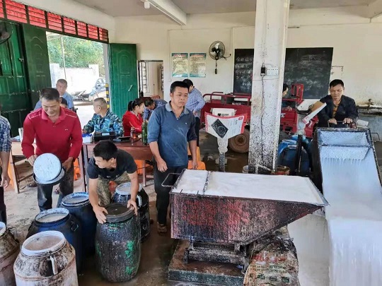 在龍江分公司雄英2隊(duì)收膠站,膠工、膠農(nóng)們紛紛前來(lái)公司收膠站賣(mài)膠水。袁國(guó)華攝